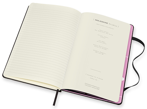 Крім лімітованих фішок у блокнота присутній весь стандартний набір улюблених "молескінівських" деталей — сторінки в лінію, кишеня для важливих дрібничок на звороті обкладинки, фіксуюча резинка, закладка-лясе, заокруглені кути, титульна сторінка для інформації про власника блокнота.