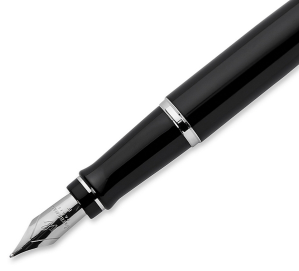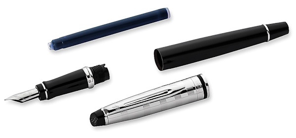Ручка оснащена майстерно виготовленим сталевим пером з вигравіюваною емблемою Waterman. Товщина пера F (тонке). У комплекті один картридж з чорними чорнилами. На папір вони лягають безперервно та швидко сохнуть. Для приємного враження не тільки від дизайну, а й від якісного письма, заправляти ці ручки рекомендується картриджами та чорнилами Waterman.