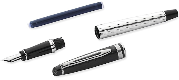 Ручка оснащена майстерно виготовленим сталевим пером з вигравіюваною емблемою Waterman. Товщина пера F (тонке). У комплекті один картридж з чорними чорнилами. На папір вони лягають безперервно та швидко сохнуть. Для приємного враження не тільки від дизайну, а й від якісного письма, заправляти ці ручки рекомендується картриджами та чорнилами Waterman.