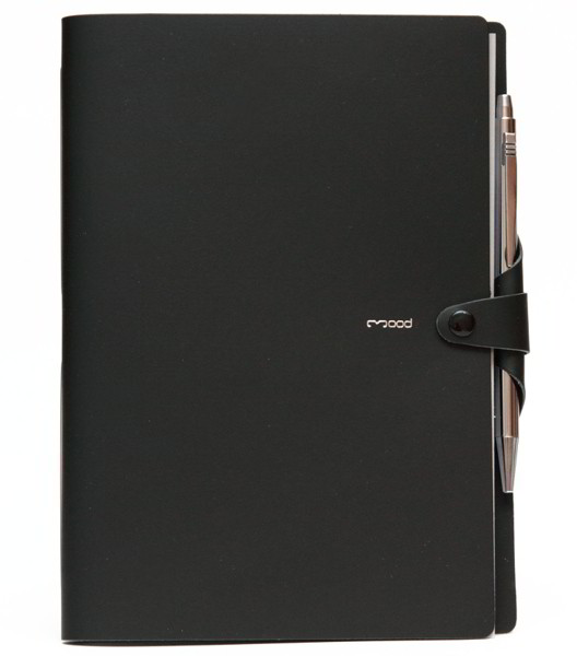 Щотижневик закривається на кнопку. Обкладинка Mood зроблена з переробленої шкіри, що відповідає високим стандартам якості і екологічного виробництва. У комплекті є ручка сріблястого кольору, яка кріпиться до обкладинки за спеціальну петельку.