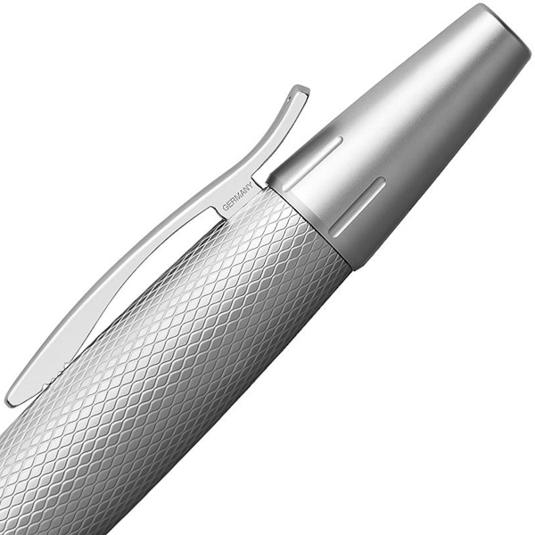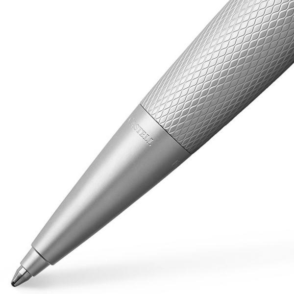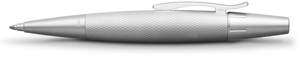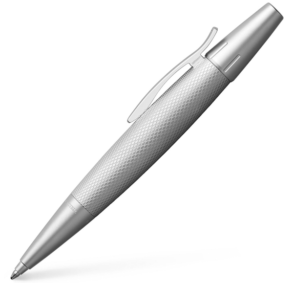 Елегантна кулькова ручка E-motion створена привертати увагу. Корпус виготовлено з анодованого алюмінію матового сріблястого кольору з гравіюванням у техніці гільйош. Є кліпса. Поворотний механізм. Чорний стрижень. Письмовий вузол: B (товстий). Діаметр кульки: 0,9 мм. Розміри ручки: 12,7 х 1,4 см. Виробництво: Faber-Castell (Німеччина).