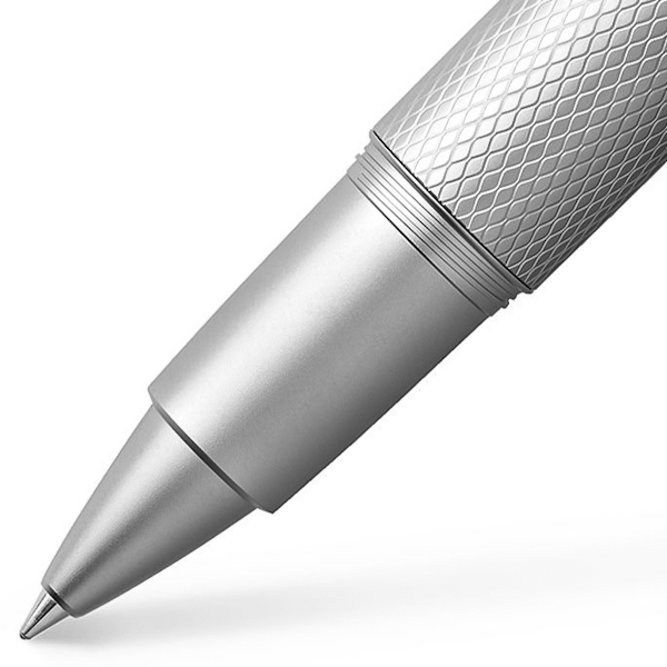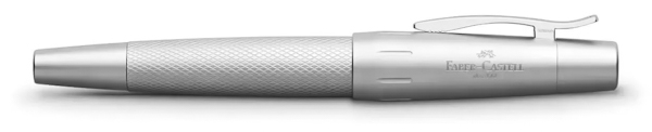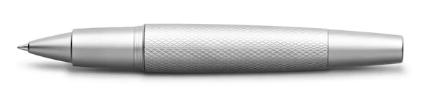 Елегантна ролерна ручка E-motion створена привертати увагу. Корпус виготовлено з анодованого алюмінію матового сріблястого кольору з гравіюванням у техніці гільйош. Є кліпса. Ковпачок з різьбою. Чорний стрижень. Письмовий вузол: M (середній). Діаметр кульки: 0,5 мм. Розміри ручки: 13,6 х 1,3 см. Виробництво: Faber-Castell (Німеччина).