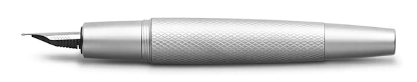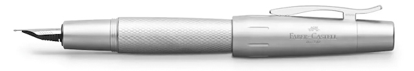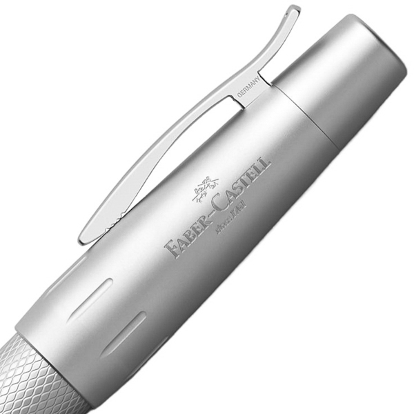 Елегантна чорнильна ручка E-motion створена привертати увагу. Корпус виготовлено з анодованого алюмінію матового сріблястого кольору з гравіюванням у техніці гільйош. Є кліпса. Ковпачок з різьбою. Сталеве перо. Товщина пера: F (тонке), 0,5 мм. Розміри ручки: 13,6 х 1,3 см. Виробництво: Faber-Castell (Німеччина).