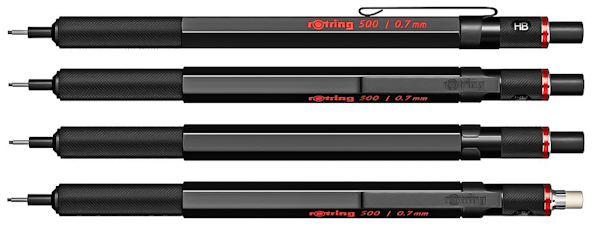 Механічний олівець преміального класу Rotring Drawing 500 у чорному пластиковому корпусі. Ергономічна металева зона захоплення зі спеціальними насічками, поворотний індикатор твердості (4H, 2H, H, F, HB, B, 2В), металевий кліп. Гумка захована під кнопкою. Грифель HB товщиною 0,7 мм у комплекті. Зроблено в Японії.