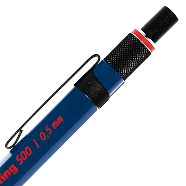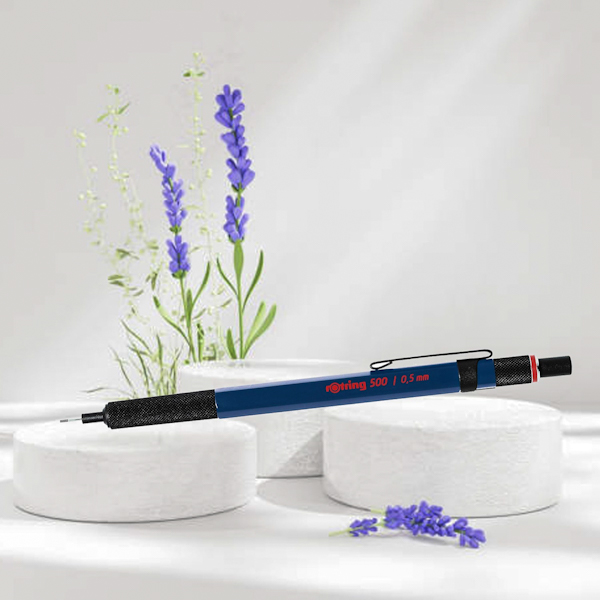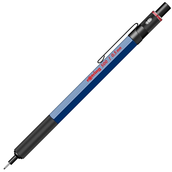 Механічний олівець преміального класу Rotring Drawing 500 у синьому пластиковому корпусі. Ергономічна металева зона захоплення зі спеціальними насічками, поворотний індикатор твердості (4H, 2H, H, F, HB, B, 2В), металевий кліп. Гумка захована під кнопкою. Грифель HB товщиною 0,5 мм у комплекті. Зроблено в Японії.
