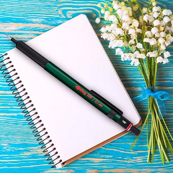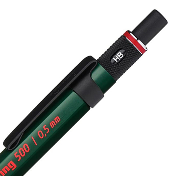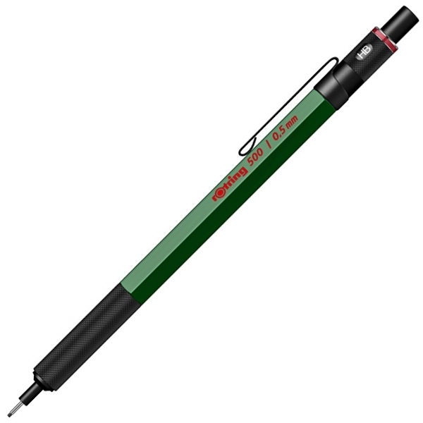 Механічний олівець преміального класу Rotring Drawing 500 у зеленому пластиковому корпусі. Ергономічна металева зона захоплення зі спеціальними насічками, поворотний індикатор твердості (4H, 2H, H, F, HB, B, 2В), металевий кліп. Гумка захована під кнопкою. Грифель HB товщиною 0,5 мм у комплекті. Зроблено в Японії.