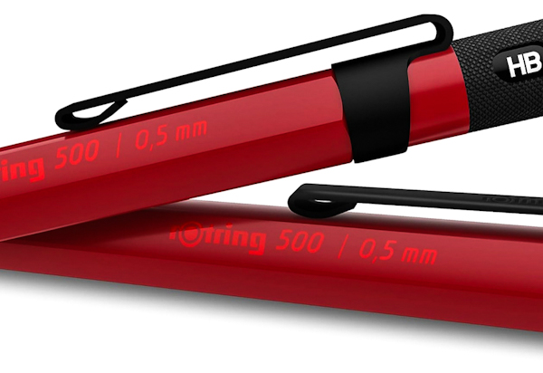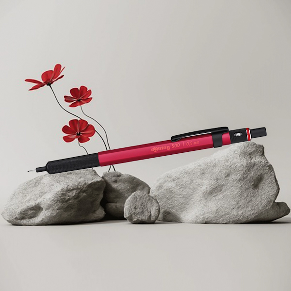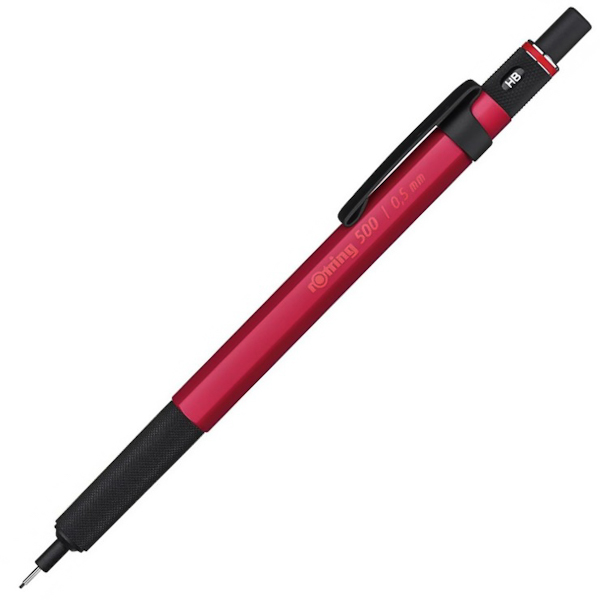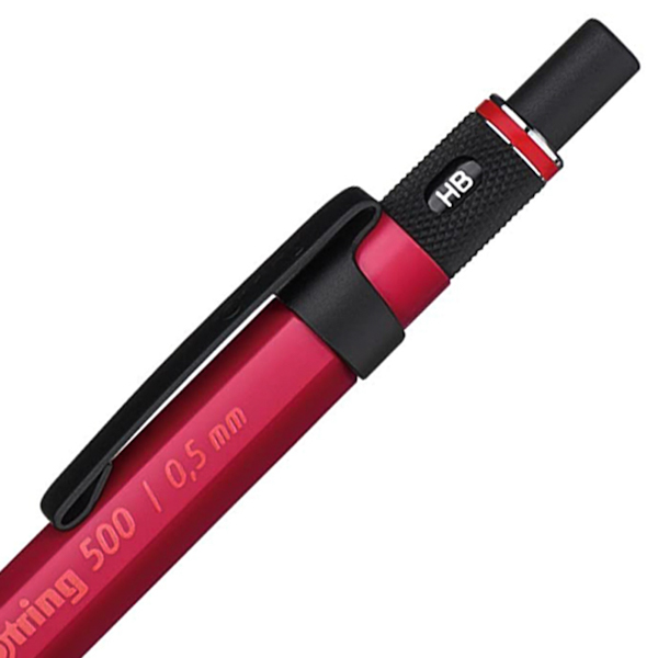 Механічний олівець преміального класу Rotring Drawing 500 у червоному пластиковому корпусі. Ергономічна металева зона захоплення зі спеціальними насічками, поворотний індикатор твердості (4H, 2H, H, F, HB, B, 2В), металевий кліп. Гумка захована під кнопкою. Грифель HB товщиною 0,5 мм у комплекті. Зроблено в Японії.