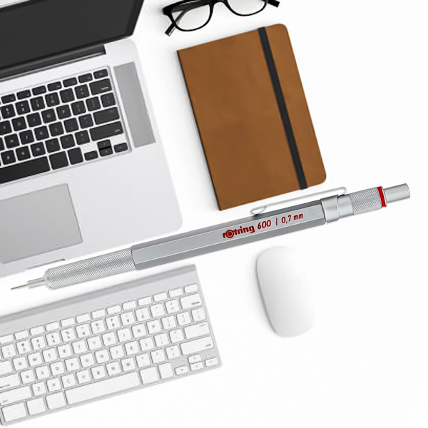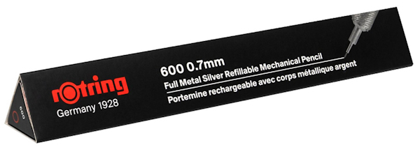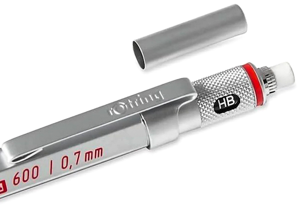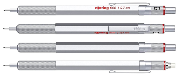 Механічний олівець преміального класу Rotring Drawing 600 у сріблястому латунному корпусі. Ергономічна зона захоплення зі спеціальними насічками, поворотний індикатор твердості (4H, 2H, H, F, HB, B, 2В), металевий кліп. Гумка захована під металевою кнопкою. Грифель HB товщиною 0,7 мм у комплекті. Упаковано в картонну коробку. Зроблено в Японії.
