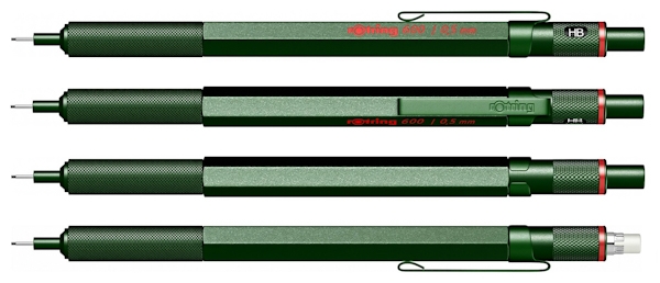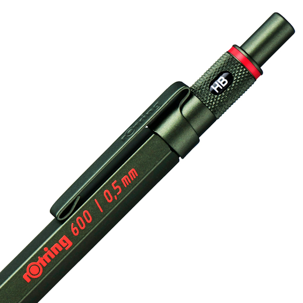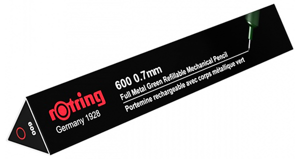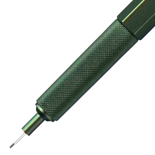 Механічний олівець преміального класу Rotring Drawing 600 у зеленому латунному корпусі. Ергономічна зона захоплення зі спеціальними насічками, поворотний індикатор твердості (4H, 2H, H, F, HB, B, 2В), металевий кліп. Гумка захована під металевою кнопкою. Грифель HB товщиною 0,5 мм у комплекті. Упаковано в картонну коробку. Зроблено в Японії.