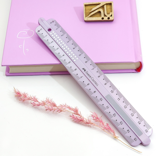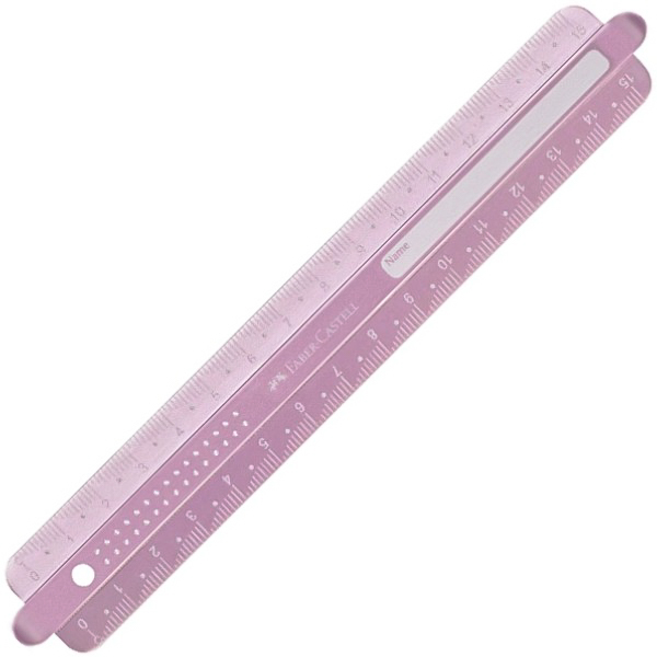Пластикова лінійка Faber-Castell. Має заокруглені краї, поле для запису імені власника та шкали вимірювання мм/см зі спеціальним розташуванням для правші та шульги. Виготовлена з поліпропілену. Довжина — 15 см.