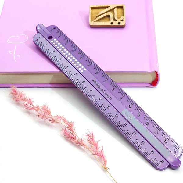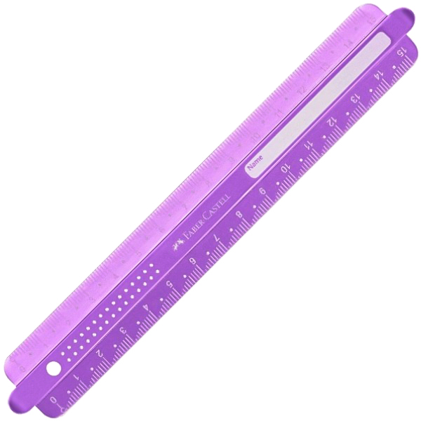 Пластикова лінійка Faber-Castell. Має заокруглені краї, поле для запису імені власника та шкали вимірювання мм/см зі спеціальним розташуванням для правші та шульги. Виготовлена з поліпропілену. Довжина — 15 см.
