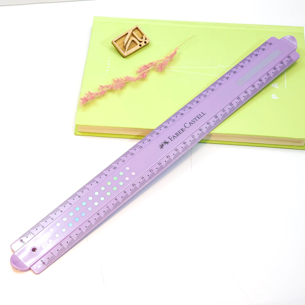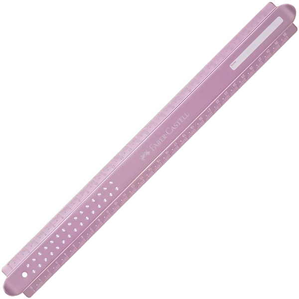 Пластикова лінійка Faber-Castell. Має заокруглені краї, поле для запису імені власника та шкали вимірювання мм/см зі спеціальним розташуванням для правші та шульги. Виготовлена з поліпропілену. Довжина — 30 см.