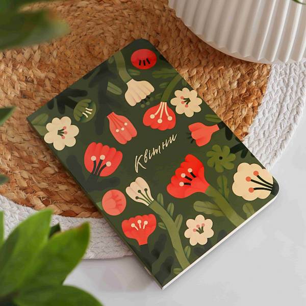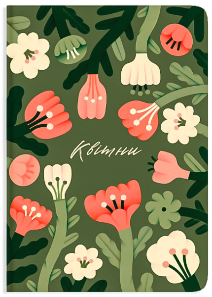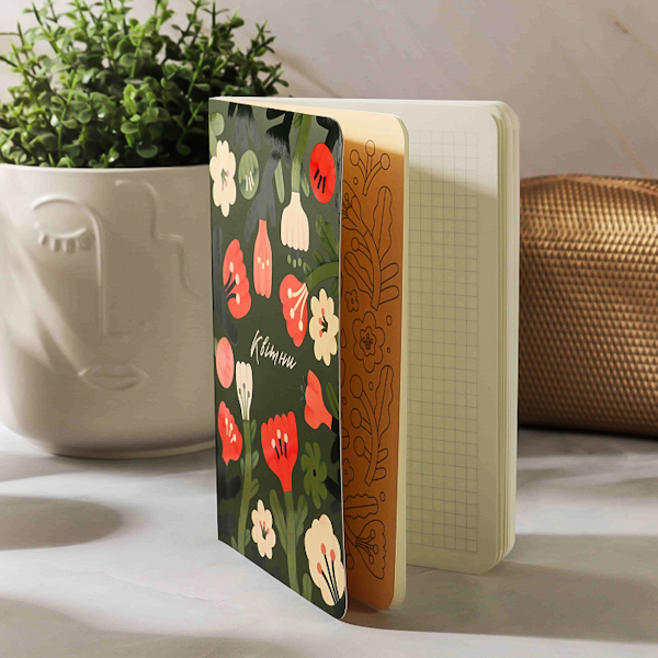 Блокнот у клітинку від українського бренду Gifty. Яскраві фарби ілюстрацій на однотонному темно-зеленому тлі, створені художницею Альбіною Колесніченко. Вони надихають, живо передаючи колоритний образ ніжних квітів, які заради життя здатні прориватися скрізь асфальт або квітнути серед холодних гірських схилів.