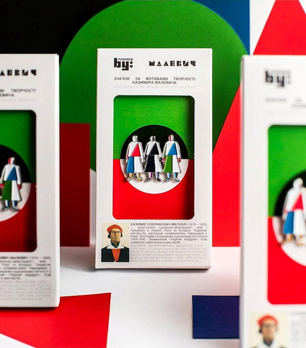 Серія патріотичних значків від українського бренду Inspired by UA створена за мотивами робіт українського художника-авангардиста Казимира Малевича. Будучи прихильником кубізму, футуризму та супрематизму, творець вміло наділяв прості геометричні форми та яскраві кольори глибоким символізмом. Пін стане зворушливою можливістю подарувати рідним чи близьким вам людям шматочок культурної спадщини України.