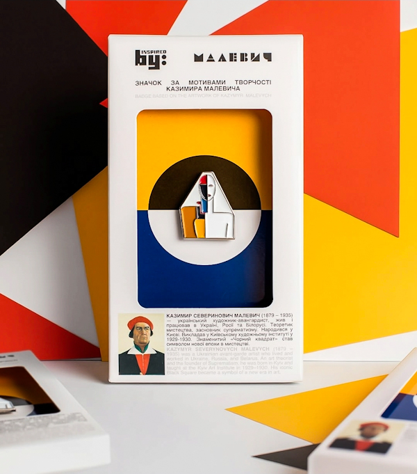 Серія патріотичних значків від українського бренду Inspired by UA створена за мотивами робіт українського художника-авангардиста Казимира Малевича. Будучи прихильником кубізму, футуризму та супрематизму, творець вміло наділяв прості геометричні форми та яскраві кольори глибоким символізмом. Пін стане зворушливою можливістю подарувати рідним чи близьким вам людям шматочок культурної спадщини України.