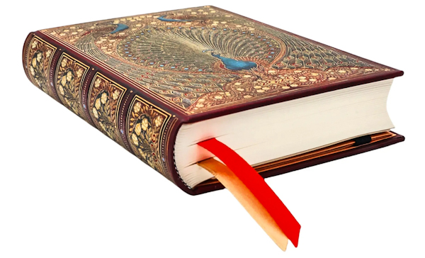 Обкладинку щоденника Paperblanks «Сангорські та Саткліфф Павичі Хафіза» прикрашає репродукція палітурки, створеної в 1910 році в англійській майстерні Sangorski & Sutcliffe (Сангорські та Саткліфф). Вона оберігає колекцію робіт під назвою «Хафіз із Ширазу: обрані фрагменти його поем». Розкішний дизайн був виготовлений з червоного та зеленого левантійського сап'яну, з трьома прикрашеними дорогоцінним камінням павичами. Птахи були пофарбовані вісьмома різними кольорами й обрамлені золотим тисненням, а сама палітурка інкрустована перлами та 33 опалами.