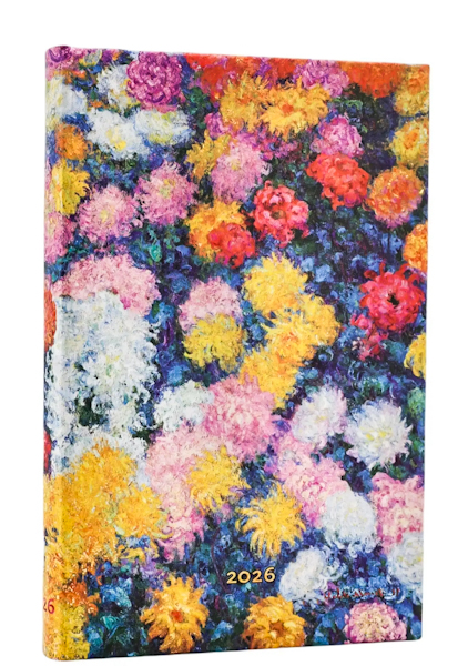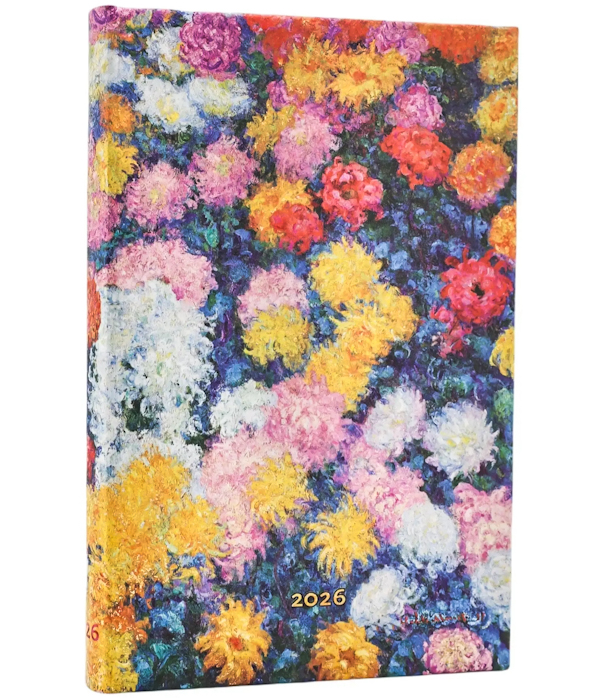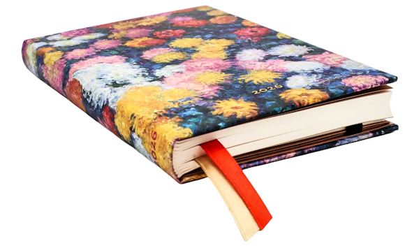 Обкладинка щотижневика Paperblanks на 2026 рік прикрашена живим та яскравим образом хризантем, створеним французьким художником-імпесіоністом Клодом Моне. Митець особливо захоплювався відображенням швидкоплинної краси природи. Ця робота 1897 року є віртуозною демонстрацією квітів, що зображує яскраву грядку хризантем із його знаменитого саду в Живерні.