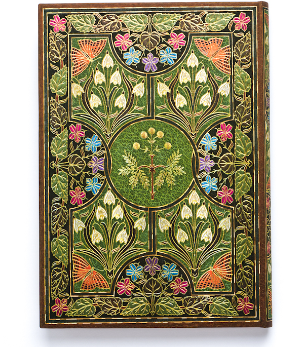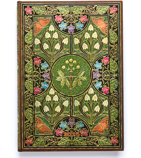 Щотижневик Paperblanks на 2026 рік із серії «Поезія у цвіті» нагадує прикрасу з золотистим орнаментом на зеленому сап'яні. Центральний елемент орнаменту мімоза, оточена контрастуючими між собою зображеннями пролісків та інших квітів, листя та метеликів, виконаними у густих тонах. Початкова обкладинка була виготовлена для поетичної збірки Персі Біші Шеллі «Мімоза і ранні поеми», в якій рослина служить автору символом у його пошуках сенсу та порядку у світі, що впадає в ентропію та хаос.