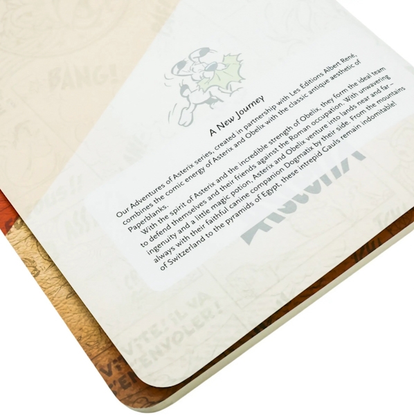 Обкладинку зошита Paperblanks прикрашає ілюстрація відомих комедійних персонажів Астерікса та Обелікса. Ця серія створена у співпраці з Les Éditions Albert René, передає дух жителів Галлії зі знаменитої серії коміксів, в яких Астерікс разом зі своїм другом Обеліксом і собакою-компаньйоном Догматіксом вирушає в подорож ближніми й далекими землями. Вони виявляють непохитну винахідливість та відвагу у досягненні цілей та у боротьбі з противником, маючи лише трохи чарівного зілля, що надає їм неймовірної сили.