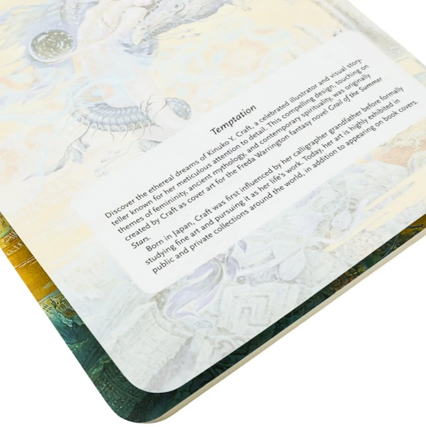 Дизайн обкладинки зошита «Видіння раю» демонструє захопливий дизайн, створений Кінуко Крафт для обкладинки фентезійного роману Фреди Уоррінгтон «Грааль літніх зірок». У своїй роботі художниця торкається тем жіночності, давньої міфології та сучасної духовності. Завдяки скрупульозній увазі до деталей, вона допомагає автору розповісти історію через ілюстрацію.