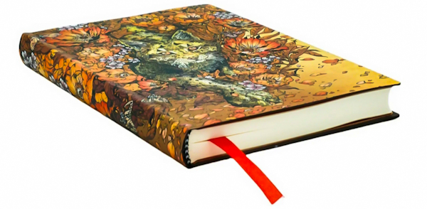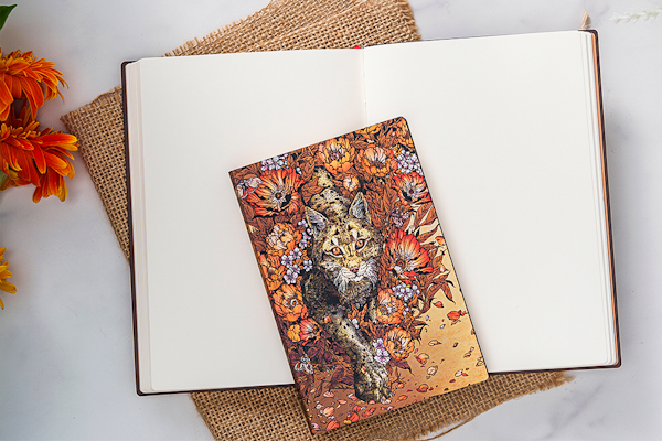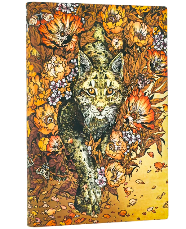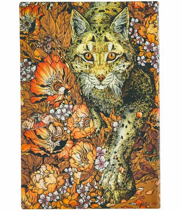 Яскравий та динамічний дизайн «Сходження рисі» із безстрашною енергією зістрибує з обкладинки блокнота Paperblanks. Рись з'являється з серпанку помаранчевих квітів на відтвореній живій сучасній роботі американської художниці та ілюстраторки Еріки Вільямс (також відомої як HookieDuke). Спочатку створений як трафаретний постер обмеженого тиражу для американського фолкдуету Watchhouse, цей малюнок захоплює уяву та переносить глядача у нові світи.