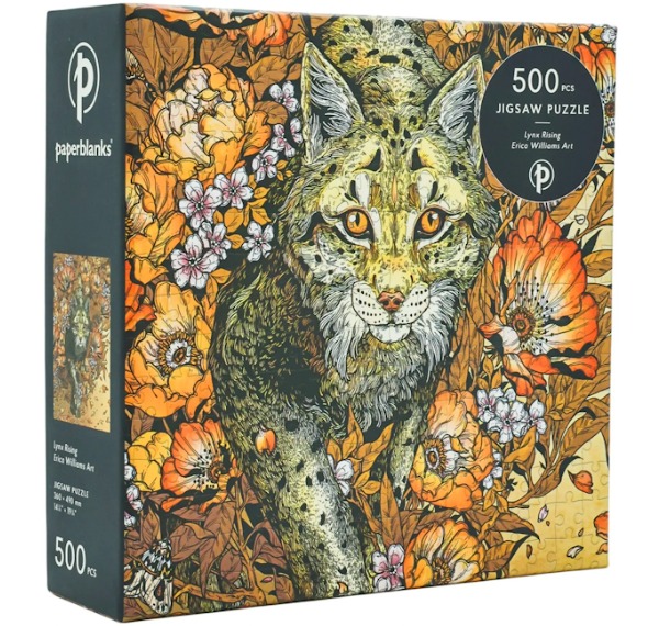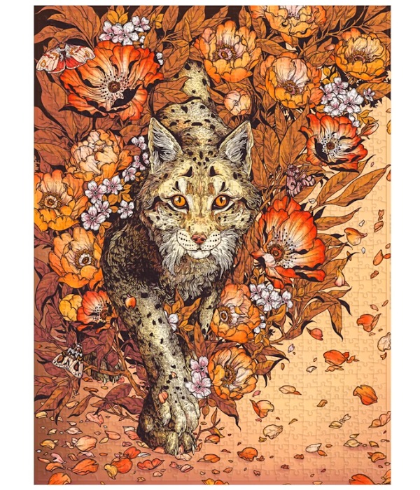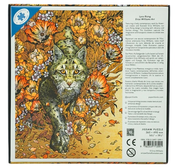 Пазл Paperblanks прикрашений яскравим та динамічним дизайном «Сходження рисі». Дика кішка з'являється з серпанку помаранчевих квітів на відтвореній живій сучасній роботі американської художниці та ілюстраторки Еріки Вільямс (також відомої як HookieDuke). Спочатку створений як трафаретний постер обмеженого тиражу для американського фолкдуету Watchhouse, цей малюнок захоплює уяву та переносить глядача у нові світи.