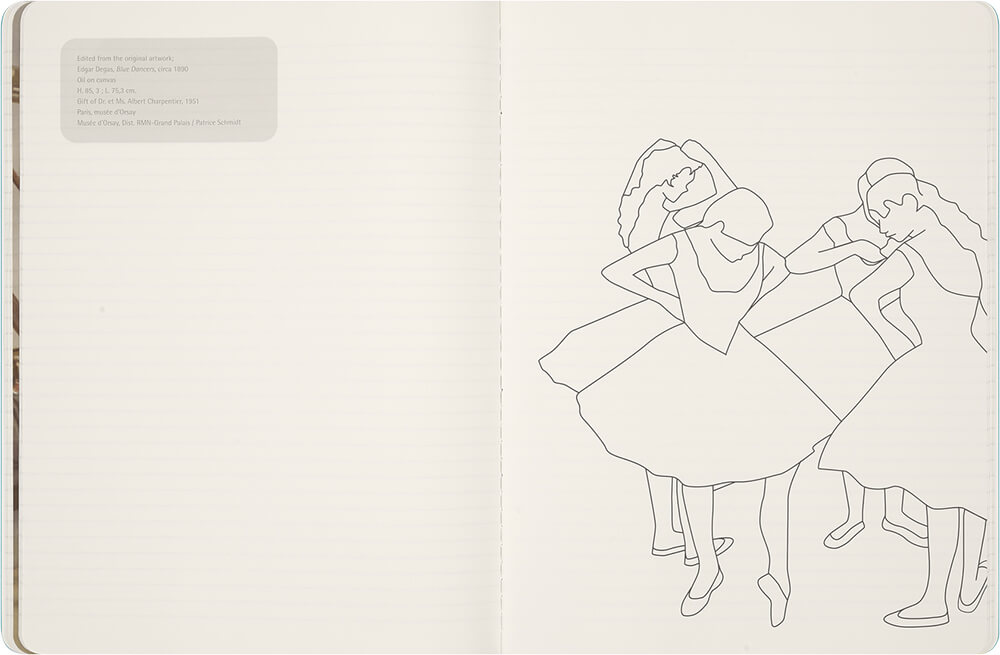 Створений як супутник для творчості, цей зошит дарує простір для думок, ідей і натхнення. Його обкладинка оздоблена стилізованим відображенням картини «Дві танцівниці на відпочинку» Едгара Дега.