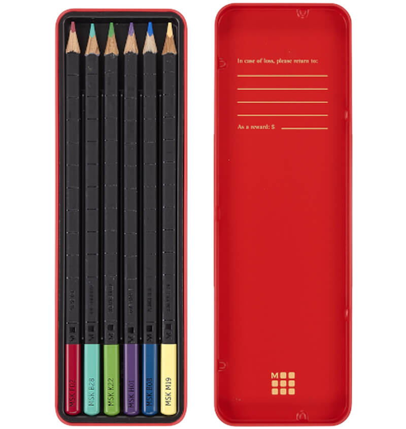 Набір з 6 акварельних олівців Moleskine + зручний металевий пенал. Стильний оригінальний дизайн та спеціально підібрана кольорова палітра. Олівці квадратного корпусу з ергономічними горизонтальними насічками та логотипом компанії. Виготовлені з натурального кедра, сертифікованого за стандартами FSC.