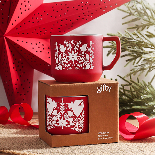 Святкова чашка українського виробництва зігріє затишним принтом та підніме настрій, а також допоможе підтримати економіку України. Колекція з різдвяними роботами художниці Альбіни Колесніченко із зображенням сучасних близьких для кожного образів. Вони підбадьорюють своїм смислом, надихають мріяти або змушують зупинитися та насолодитися миттю. Ця чашка стане чудовим подарунком родичам, друзям чи собі, як обов'язковий аксесуар для підтримки тепла у серці.