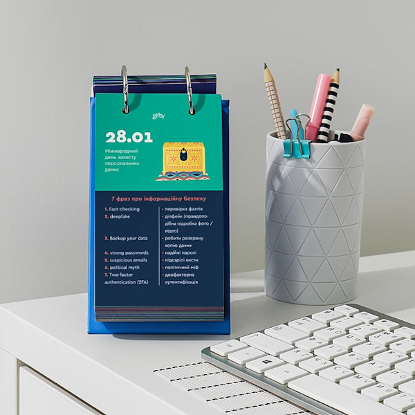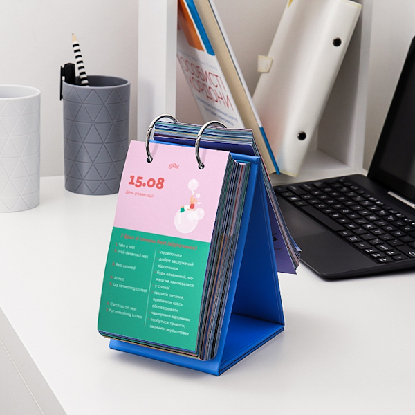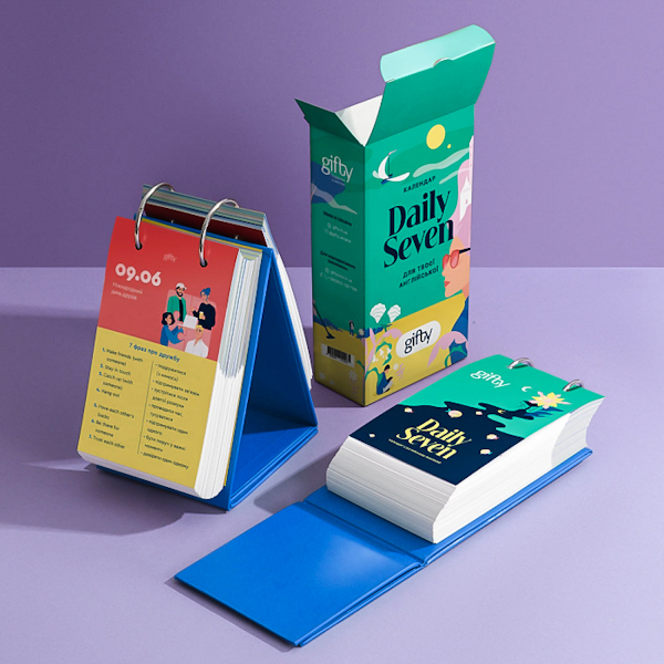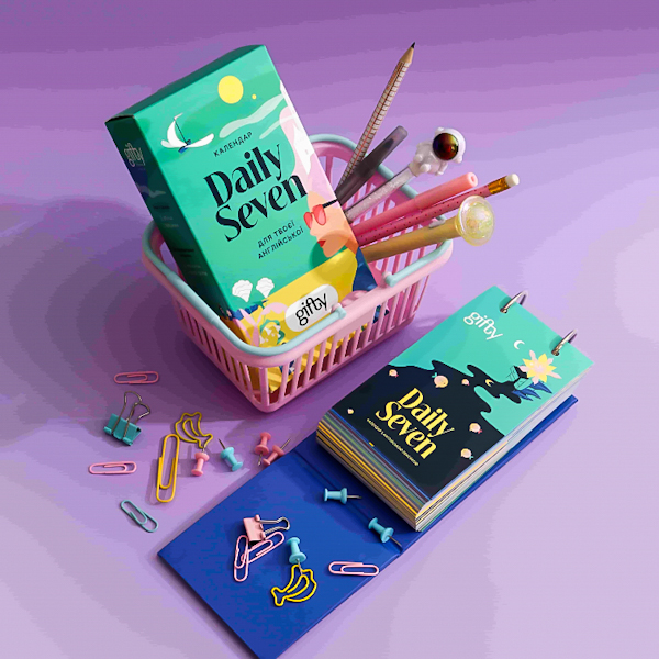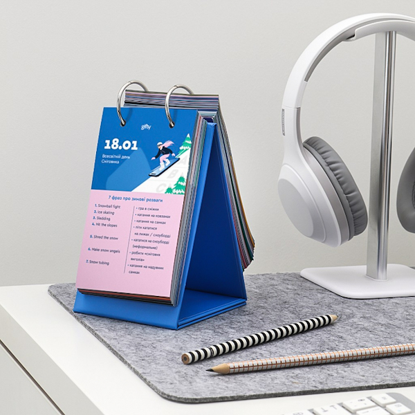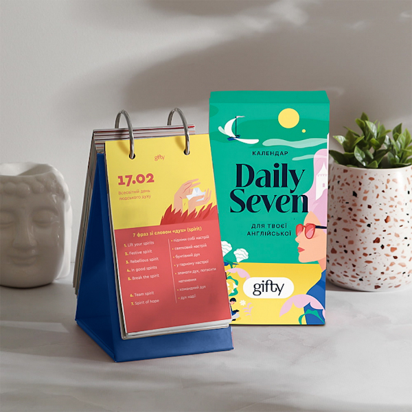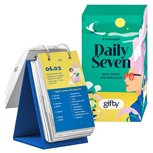 Настільний календар пропонує для щоденного вивчення 7 англійських слів або фраз з перекладом українською. Цю невелику порцію легко засвоїти, а до кінця року можна поповнити свій словниковий запас на 2555 висловів іноземною мовою. Календар Gifty "Daily Seven" створено для саморозвитку та практики з англійської. Він підійде для середнього та просунутого рівня (рівень англійської B1-B2).