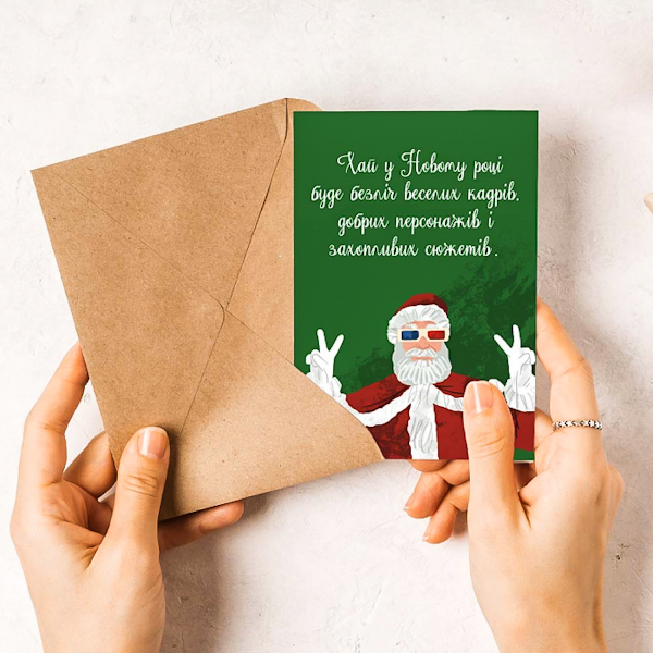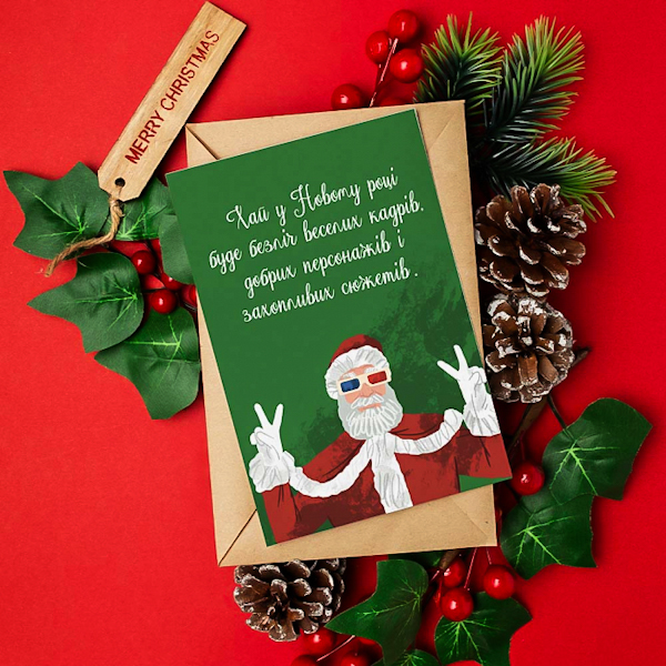 Новорічна листівка від українського бренду Gifty з веселою ілюстрацією КіноСанти. Ця дрібничка з вашими щирими побажаннями приємно доповнить подарунок та надасть святковості. Теплий і багатослівний подарунок для дорогих вам людей.