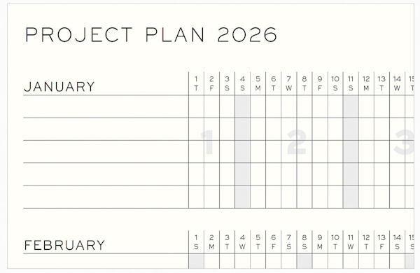 — план проєктів для подій та задач на рік. Щомісячні задачі можна відмітити ліворуч та запланувати їх по дням праворуч. Можна використовувати як трекер звичок (5 рядків на кожний місяць, 6 місяців на розгортці)