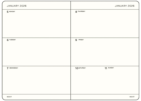 Планер Leuchtturm1917 на 12 місяців призначений для ведення записів з січня по грудень 2026 року. Розбивка — «тиждень на розвороті» + додаткові блоки. Тиждень представлений у вигляді секторів для кожного дня (субота та неділя поєднані в один сектор). Зручно переглядати тиждень повністю.