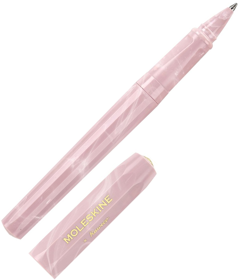 Кулькова ручка Moleskine від німецького бренду Kaweco в ностальгічному дизайні створена для задоволення від рукописного тексту. Ергономічний шестигранний корпус з восьмигранним ковпачком виконані з легкого та міцного ABS пластику ніжного рожевого відтінку з білими розводами.