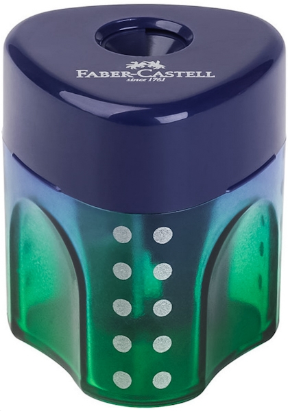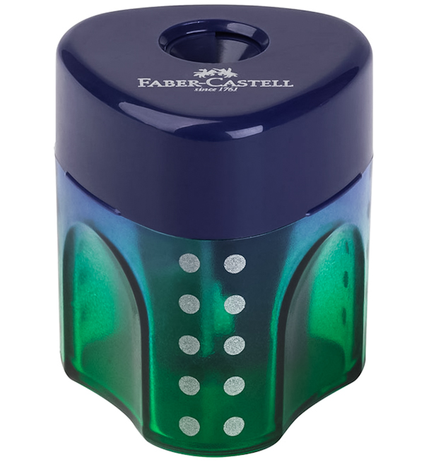 Функціональна пластикова точилка Grip Mini Flow Edition з контейнером та спеціальним клапаном, який автоматично закриває отвір після використання. Виробник — Faber-Castell (Німеччина).