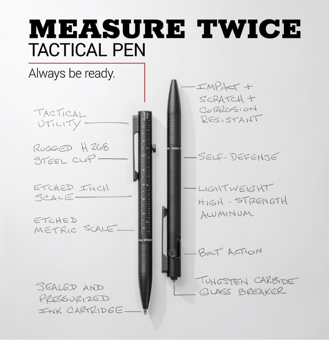 Космічна ручка Measure Twice з склобоєм — це практичний інструмент для всіх, хто цінує надійні речі з характером. Measure Twice легко стає частиною щоденного набору — коли важливо мати під рукою інструмент, на який можна покластися. Надійний затворний механізм забезпечує швидку готовність до письма, а продумана конструкція зі склобоєм та лінійкою дарує відчуття впевненості у будь-якій ситуації. Не є холодною зброєю.