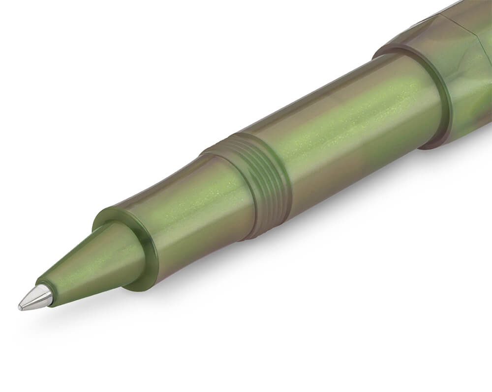 Темна база корпусу підсилює кольорові переливи — від зеленого до бронзового, які змінюються залежно від кута освітлення. Це ручка з характером, яка виглядає по-різному в різних умовах.
