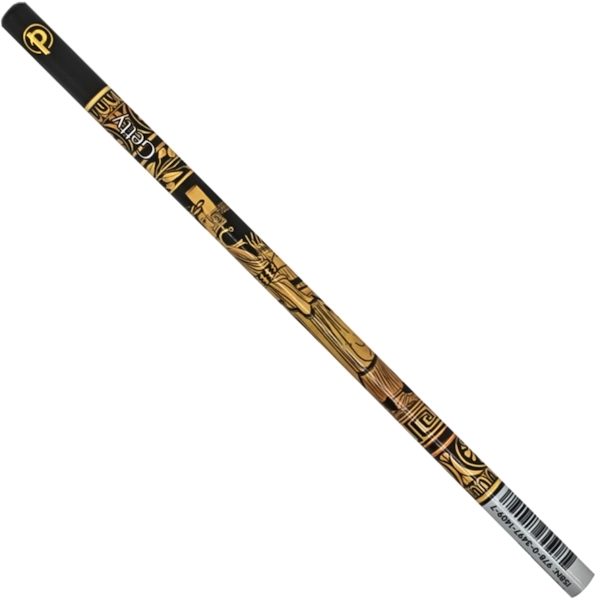 Графітний олівець має круглий корпус. Виконаний із чорної деревини сертифікованої FSC. Олівець прикрашає барвистий дизайн із нанесенням золотого фольгованого логотипа компанії.