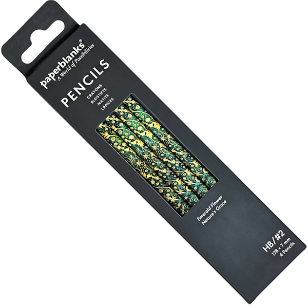 Набір графітних олівців Paperblanks «Смарагдова квітка» натхненний ірланською книжковою палітуркою 1760 року створення. Кожен олівець виготовлений з чорної деревини відповідно стандартам FSC. Корпус круглий. Твердість грифеля: HB. Розмір: 17,8 х 0,7 см. Набір упаковано в картонну коробку. Виробник: Paperblanks (Канада).
